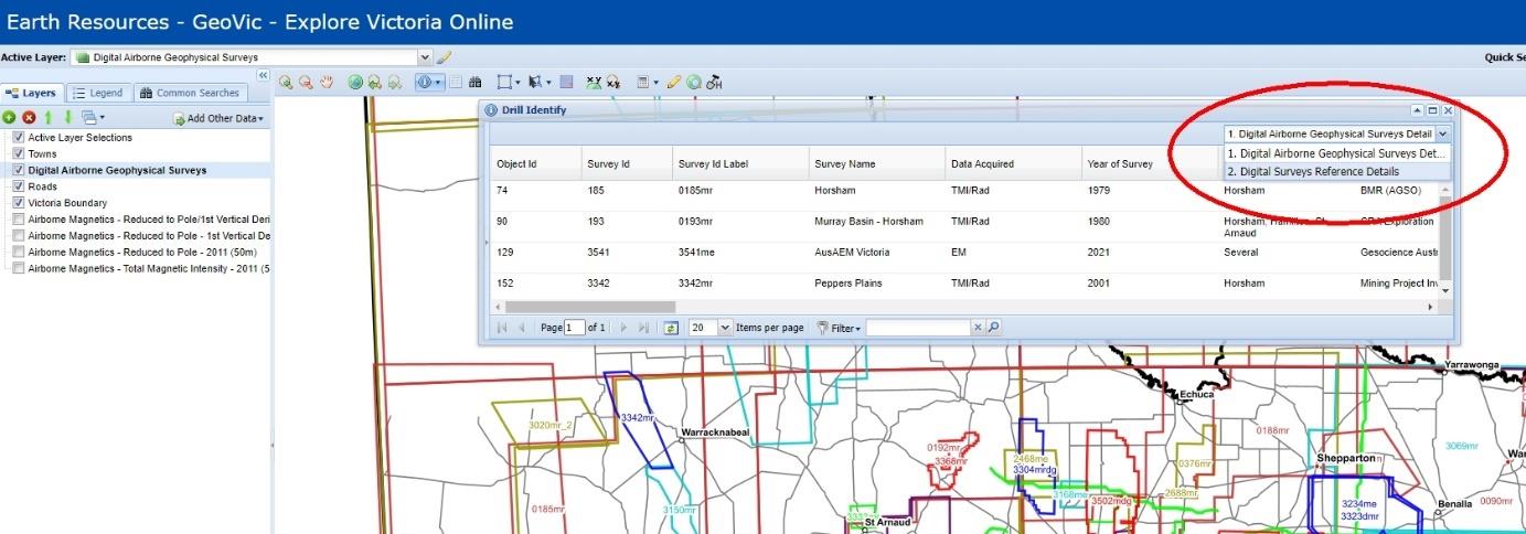 Click “Identify” button in top menu and click on survey of interest in map (or hold and drag to select area of interest).