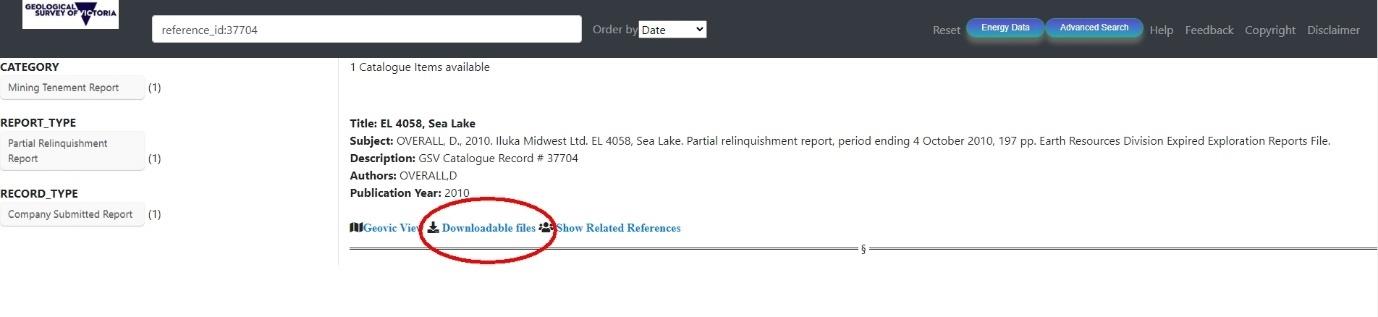 A separate webpage will open showing the relevant Search Assistant catalogue item. Click on the “Downloadable files” link to display available files.