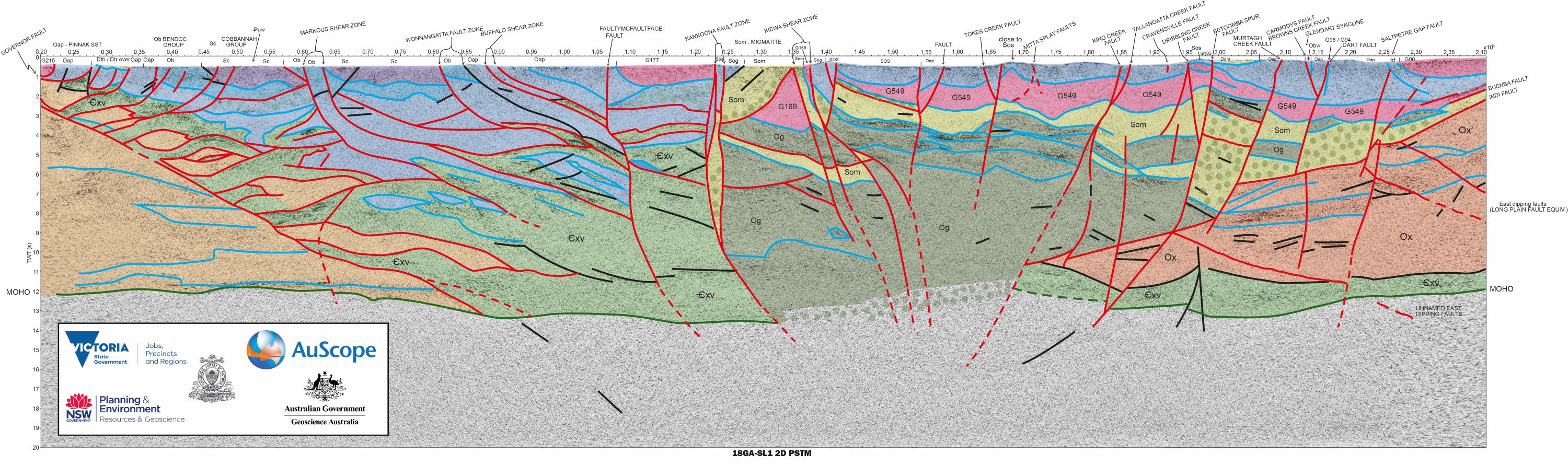 During February 2019, the project collaborators met and considered the new seismic data together with existing geoscience data along the survey route. An example of the results of this meeting and further research by project members is the first geological interpretation of Lines 1 to 3 (18GA-SL1, 18GA-SL2, 18GA-SL3) shown below. These results were presented as posters and a paper (PDF 184 kB) at “Discoveries in the Tasmanides 2019” in Wagga Wagga, NSW.