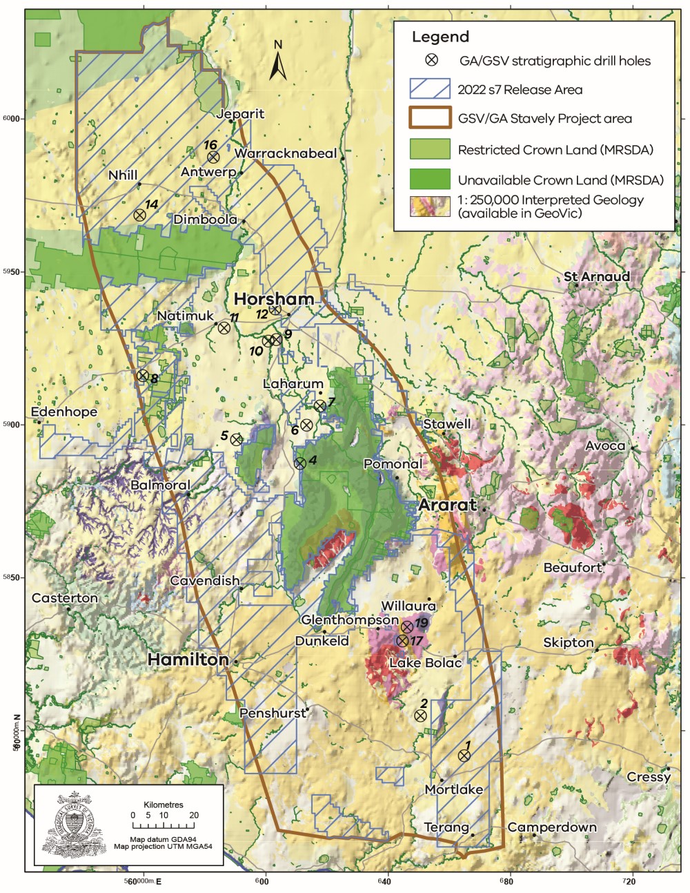 The geoscientific work carried out through the Stavely Geoscience Project was a collaboration involving Geoscience Australia, the Geological Survey of Victoria (GSV), the Deep Exploration Technology Cooperative Research Centre, and other partners between 2015 and 2018. The project produced a suite of pre-competitive geoscience data, a Regional Synthesis and a 3D geological model of the area.