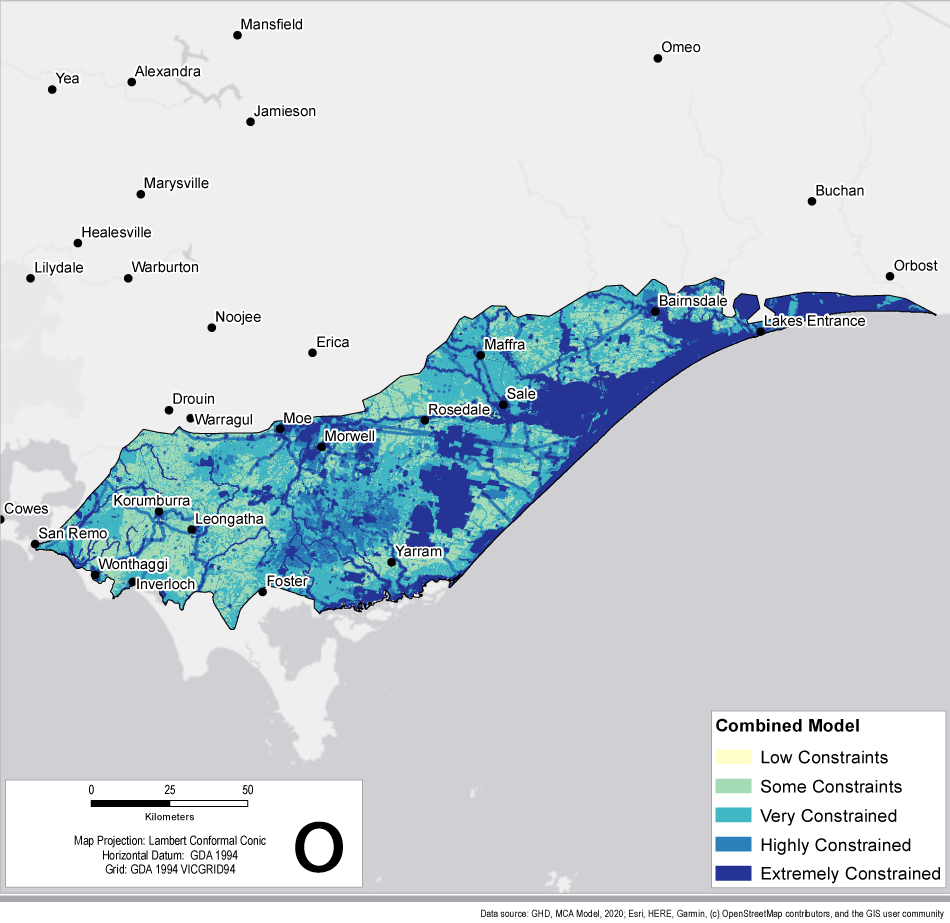 The model indicates that there are no areas without some level of constraint in the Gippsland Basin. Therefore, all areas require appropriate planning and management (as set out in Victoria’s petroleum regulations) if gas development were to take place.